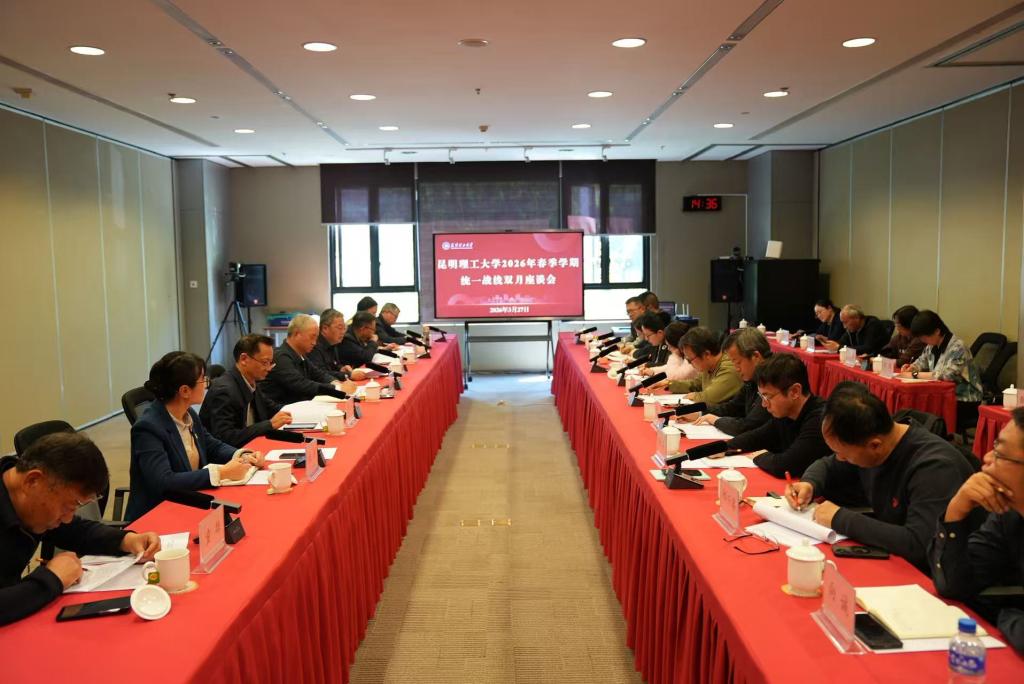 3月27日下午,昆明理工大学2026年春季学期统一战线双月座谈会在莲华校区召开。会议主题是:学习贯彻党中央关于统战工作的决策部署、省委工作要求和学校党委工作安排,总结2025年工作,布置2026年任务,为实现“十五五”发展良好开局、决战决胜“双一流”创建贡献力量。校党委书记唐家华、校党委副书记蔡金红出席会议。