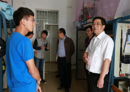 在网上录取现场,彭金辉校长实地查看了招录工作情况及工作环境,并对全体招生录取人员的辛勤劳动表示感谢;在组织部,彭校长叮嘱工作人员要严肃认真地做好学校干部换届的相关工作;在校医院,彭校长详细询问了校园院医生护士假期值班安排情况,及近期入院患者相关情况;在听取了保卫处负责人关于假期校园安全保卫工作的简要汇报后,彭校长要求暑期值守人员要提高安全意识,坚守岗位,维护假期校园安全稳定;在学生食堂,彭校长一行深入厨房,关注每一个食品卫生安全环节,要求工作人员们务必做好假期相关后勤保障工作。