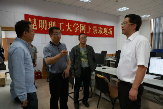 7月5日上午,昆明理工大学校长彭金辉、副校长袁希平在相关部门负责人的陪同下,先后走访了莲华校区昆明理工教育发展有限公司、昆明理工大学网上录取现场,呈贡校区办公楼组织部办公室、校办公室、保卫处校园110控制室、怡园学生社区宿舍楼、怡园学生食堂、校医院,看望并慰问了暑假期间依然坚守在工作岗位一线的教职工们,并现场了解招生、办公场所调整、维修项目进展等各项暑期工作进展情况,并专程前往1号网球馆看望了备战本月25日在学校召开的全国大学生网球比赛的师生们。