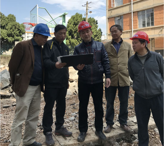2017年4月3日上午,周峰越副校长到莲华校区昆工附属中小学改造现场检查和协调工作。基建处、教育发展公司、施工单位、监理单位负责人就施工进展、存在的难点进行了汇报。