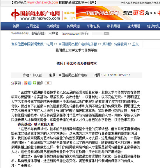2017年1月10日,国家新闻出版广电总局主办的《中国新闻出版广电报》对昆明理工大学艺术与传媒学院的新闻传播办学进行了专题报道,题目为《昆明理工大学艺术与传媒学院——依托工科优势 普及传播技术》,同版报道的另外两个学院分别是美国哥伦比亚大学新闻学院、清华大学新闻与传播学院。