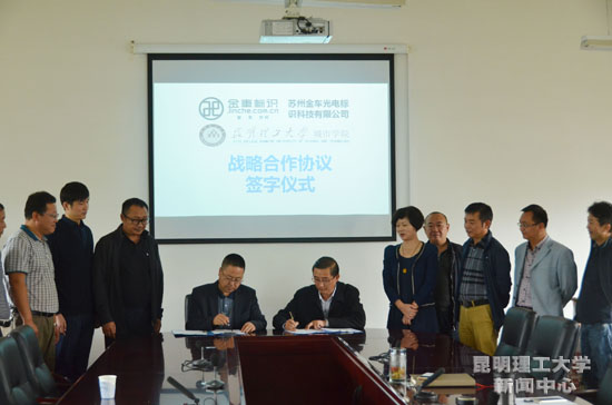 洽谈会后,举行了签字仪式,金车集团公司董事长宋占超与昆明理工大学城市学院院长樊刚分别代表企业和学院签署了战略合作协议。