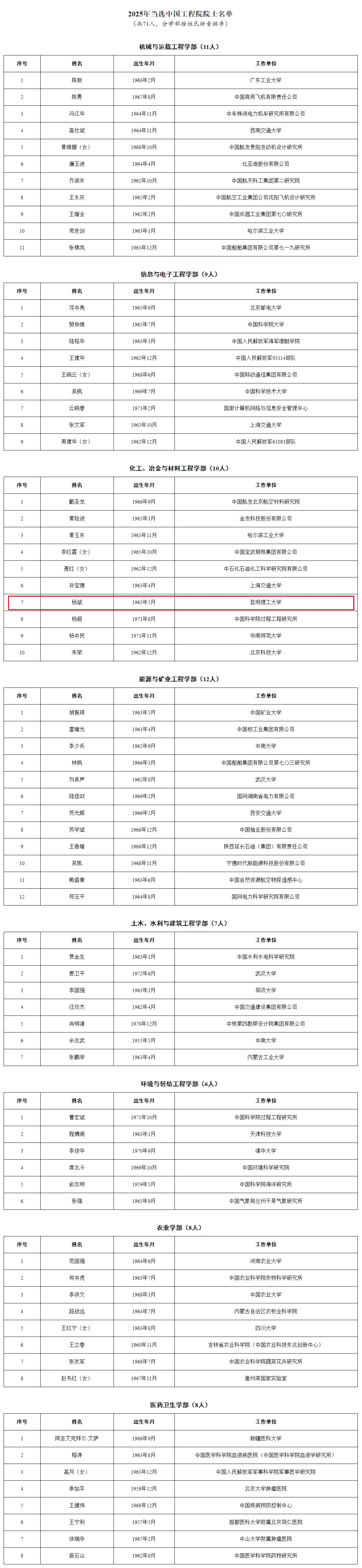 11月21日,2025年两院院士增选结果正式揭晓,共有144人当选。其中,共选举产生中国科学院院士73人,选举产生中国工程院院士71人。昆明理工大学教授杨斌当选中国工程院院士。