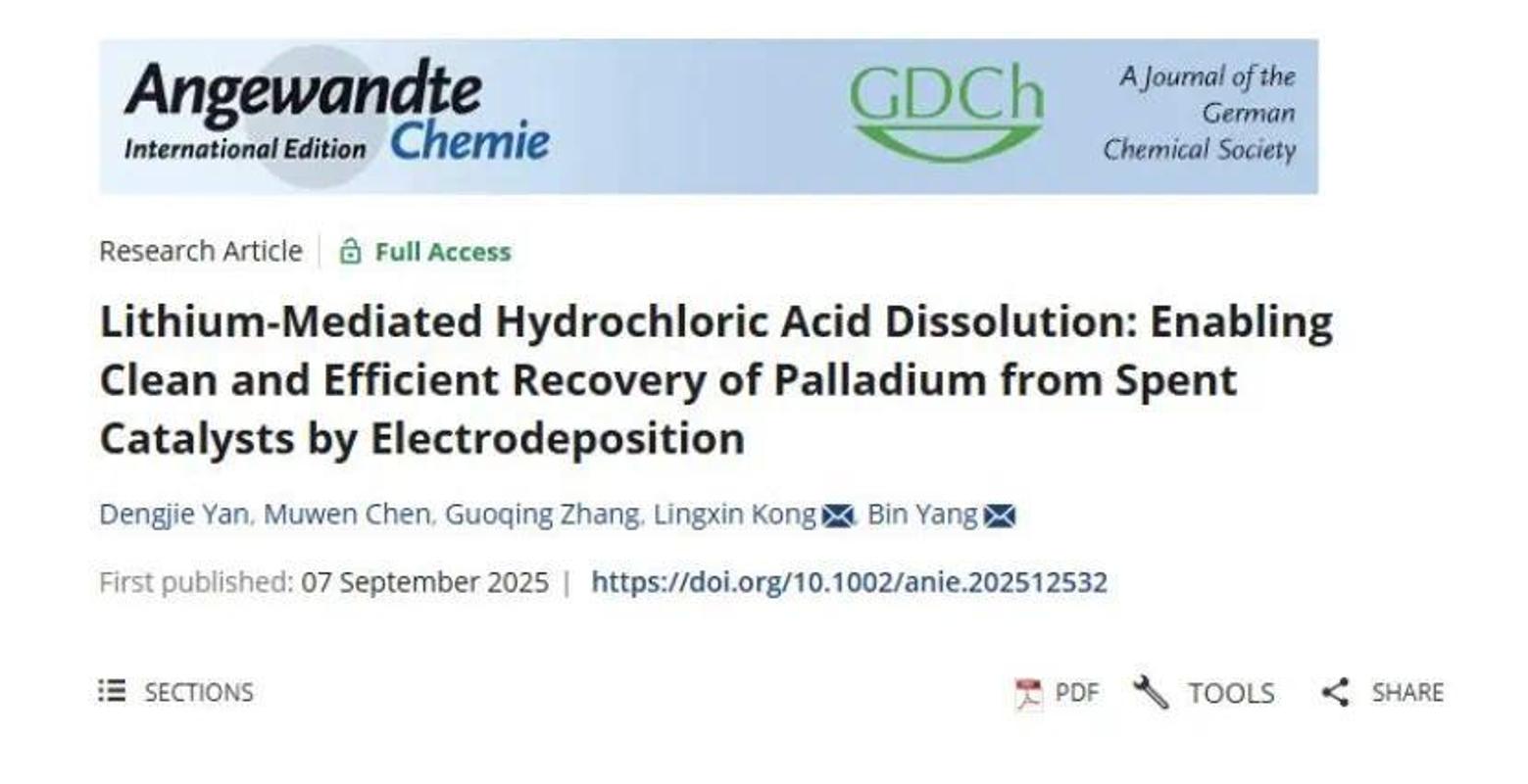 相关成果以“Lithium-Mediated Hydrochloric Acid Dissolution:Enabling Clean and Efficient Recovery of Palladium from Spent Catalysts by Electrodeposition”为题发表在化学领域顶级期刊《Angewandte Chemie International Edition》上。