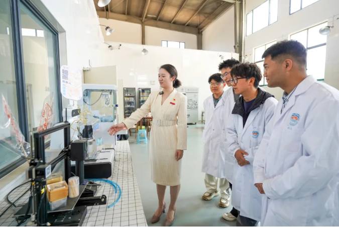 易俊洁(左一)和学生在实验室交流学习。郝亚鑫 摄