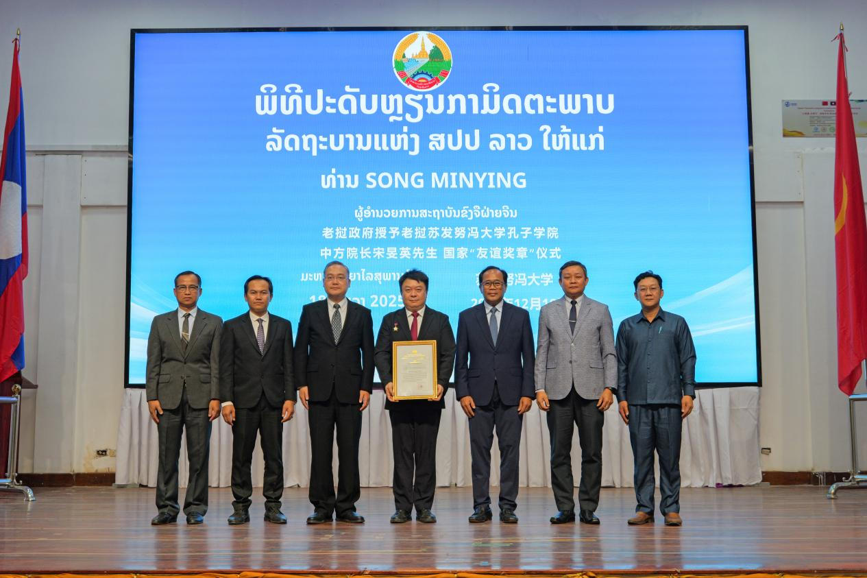 人民网曼谷12月25日电 (记者杨一)琅勃拉邦消息:老挝总理宋赛·西潘敦近日签署总理令,决定授予老挝苏发努冯大学孔子学院中方院长宋旻英国家“友谊奖章”,此系老挝政府授予有突出贡献的外国友人的最高等级奖章;老挝人民革命青年团委员会书记通利·西苏里签署决议,决定授予该校中方公派教师谢雨瑶、李边秀老挝人民革命青年团最高荣誉“青年奋斗奖章”,以表彰他们在任期间为推动中老文化教育交流、老挝本地中文人才培养及两国友好事业作出的贡献。