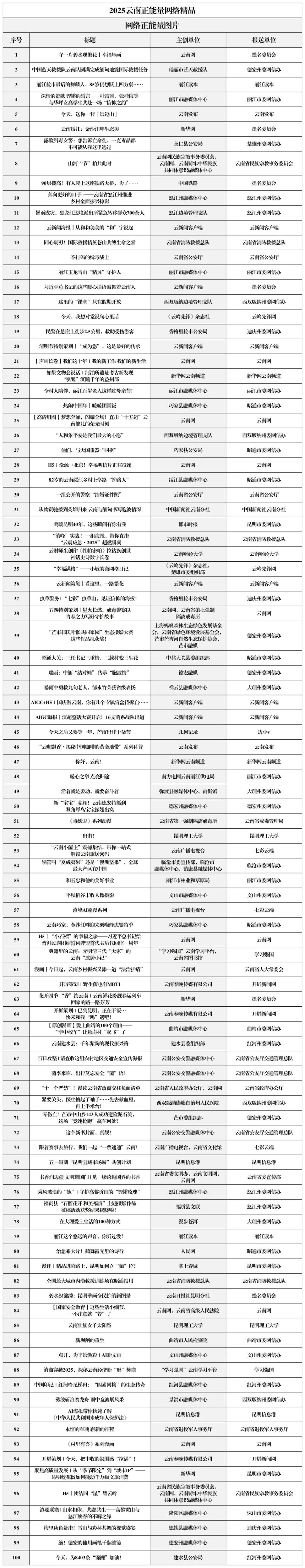 2025中国正能量网络精品和中国正能量网络传播AI精品案例入选名单在3月28日至29日举行的2026中国网络媒体论坛上正式发布。云南省共有10件作品入选中国正能量网络精品,3件作品入选中国正能量网络传播AI精品案例。 为做大做强网上正面宣传的声量、流量,云南省同步开展了2025云南正能量网络精品征集展播活动,发掘和推出了515件有温度、有力量、有影响力的云南网络正能量精品。现将名单一并公布。