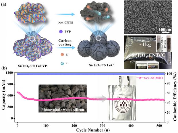 蓬勃发展的光伏产业带来大量的硅切割废料,不当处置不仅可能带来巨大的资源浪费,还会增加严重的环境负担。针对硅切割废料的高效增值回用难题,昆明理工大学硅冶金与硅材料团队提出借助光伏硅切割废料独特二维结构特征,制备高性能硅基负极材料。通过砂磨构建起硅与二氧化钛(TiO2)的强界面耦合,借助刚性相界面粘附与载荷分担协同缓解体积变化,实现了高性能硅基复合材料的制备,所得Si/TiO2/CNTs/C复合材料振实密度达到 0.9 g·cm-3,组装的软包全电池能量密度达到 320 Wh·kg-1,并保持了优异的循环性能和倍率性能。研究团队在实验室实现了公斤级高性能硅基复合材料的制备,为光伏硅切割废料高值回用制备高性能硅基负极的可行性提供了新路径。、
