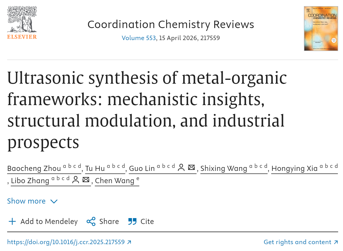 金属有机框架材料(MOFs)作为一类具有高比表面积、可调孔径及可修饰化学功能的晶态多孔材料,在能源、环境、医药等领域的应用日益广泛。然而,如何实现其绿色、高效、规模化生产,是目前推动相关产业化进程中面临的关键挑战。传统合成方法通常反应时间长、能耗较高,且往往依赖于有毒溶剂,这些因素制约了其大规模工业应用。近年来,超声波合成(Ultrasonic Synthesis, US)作为一种具有潜力的绿色合成途径受到关注,但其作用机理、结构调控的系统性策略以及面向工业转化的可行路径,仍待进一步系统梳理与深入探讨。在此背景下,昆明理工大学非常规冶金团队近期在化学领域权威期刊《Coordination Chemistry Reviews》上发表了题为“Ultrasonic synthesis of metal-organic frameworks: mechanistic insights, structural modulation, and industrial prospects”的综述论文。