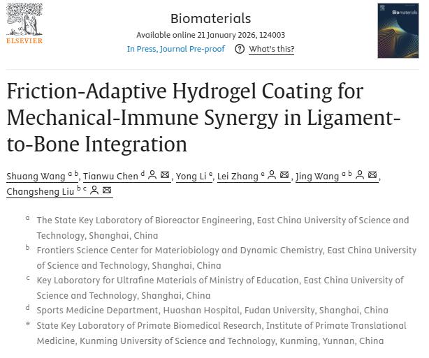 近日,昆明理工大学灵长类转化医学研究院张磊团队联合华东理工大学刘昌胜院士团队、复旦大学华山医院运动医学科陈天午等,在智能生物材料精准修复领域取得重要进展。相关研究成果以“Friction-Adaptive Hydrogel Coating for Mechanical-Immune Synergy in Ligament-to-Bone Integration”为题发表于生物材料领域顶刊《Biomaterials》,提出一种“力学-免疫”协同调控策略,为人工韧带骨整合难题提供了创新性解决方案。