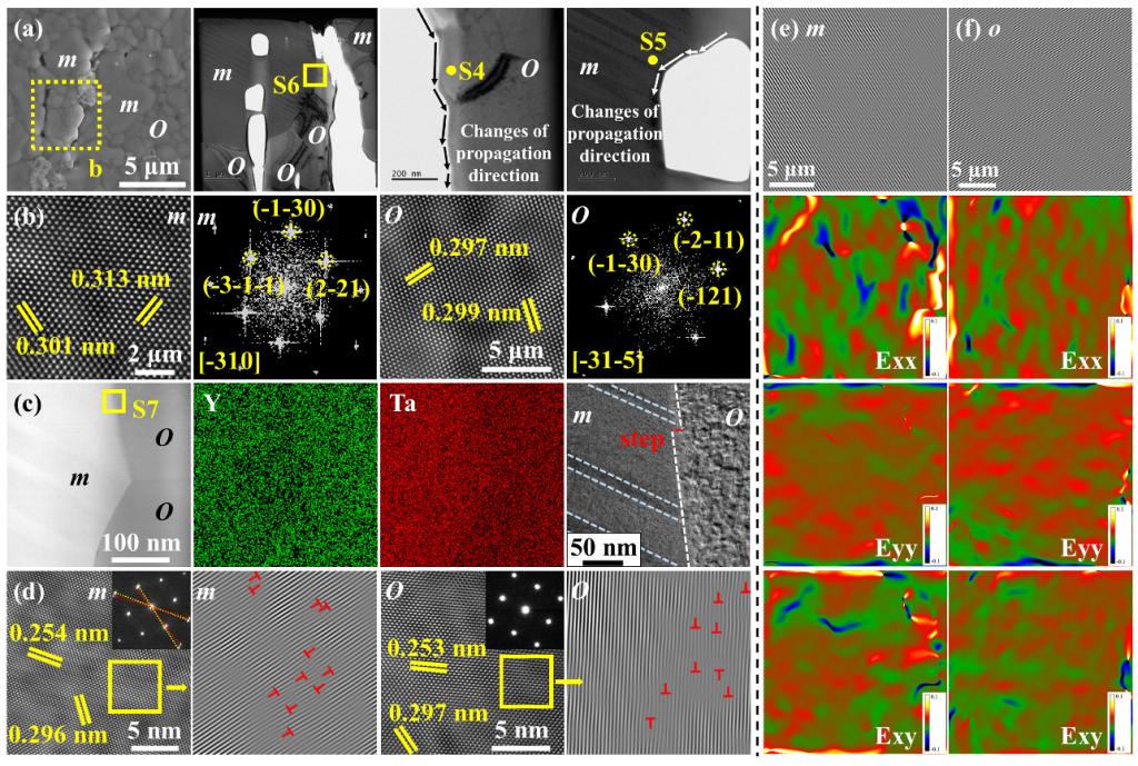 高韧性、低热导是保障陶瓷热防护涂层材料长寿命、高隔热的核心性能指标,但是在氧化物陶瓷中其热导率与断裂韧性之间存在相互耦合限制的关系。氧化物陶瓷硬而脆,高硬度意味着高的声子传播速度,从而产生高的热导率,传统性能优化方式难以打破脆性陶瓷“高韧性-低热导率”之间的耦合限制关系。昆明理工大学陈琳、冯晶团队十余年来深耕铁弹性陶瓷热防护涂层材料领域,在本研究中通过球差矫正透射电镜原子级别表征提出了铁弹畴增韧新理论,在应力作用下铁弹畴通过偏转裂纹、畴转变、裂纹桥接等方式消耗断裂能提高断裂韧性;同时,研究团队在铁弹性陶瓷中通过引入与其具有类共格界面的增强相,并通过SPS和高温热处理的方式加速元素迁移,在晶格中引入高密度位错,在脆性陶瓷中构建了“铁弹畴+高密度位错”增韧新机制。铁弹性复合陶瓷断裂韧性最高值可达5.0 MPa·m1/2,相较于单相材料提高达100%,断裂韧性是传统YSZ材料的1.4倍。