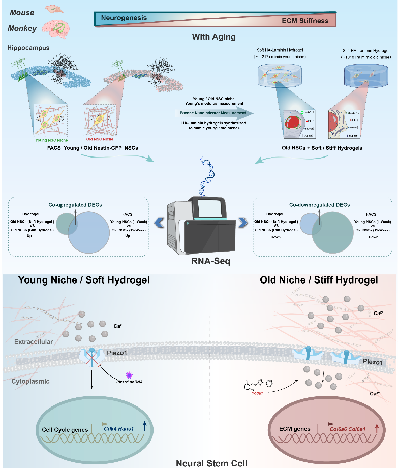 神经干细胞(Neural Stem Cells, NSCs)是维持海马神经发生的重要细胞群体,与学习记忆等脑功能密切相关。随着年龄增长,其增殖和神经元生成能力逐渐下降,导致神经发生减少,被认为是脑衰老的重要特征之一。因此,阐明神经干细胞衰老的调控机制,对于理解脑衰老及开发神经再生治疗策略具有重要意义。近年来,越来越多研究表明,干细胞所处的“微环境”(Niche)在调控干细胞命运中发挥关键作用。除了传统的生化信号外,细胞外基质的力学性质,如组织硬度,也被认为是影响干细胞行为的重要因素。然而,在脑衰老过程中,神经干细胞微环境的力学变化及其对神经干细胞功能的影响仍缺乏系统研究。