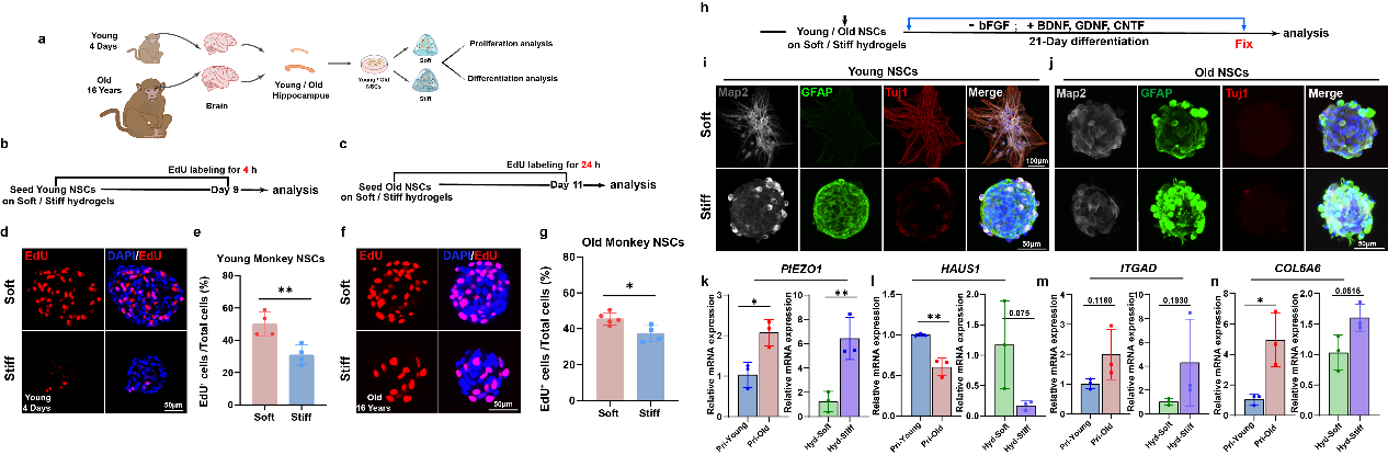 为了探索这一机制在不同物种中的保守性和特异性,研究团队还在恒河猴神经干细胞中进行了研究。结果表明,灵长类神经干细胞同样对基质硬度变化高度敏感:高硬度环境抑制细胞增殖并促进星形胶质分化,而柔软环境可部分恢复年老猴神经细胞的增殖,分化功能则难以恢复。同时,Piezo1、细胞周期和细胞黏附相关基因的表达变化也与小鼠结果高度一致,说明海马微环境硬度调控神经干细胞衰老的机制在哺乳动物中具有进化保守性,但也存在细微差异。