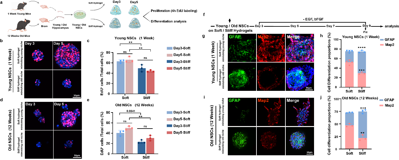 图3. 模拟不同年龄微环境硬度的水凝胶重塑神经干细胞增殖与分化潜能