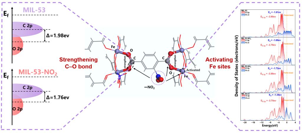 鉴于此,昆明理工大学胡觉教授团队提出了一种配体工程策略,以解决MOF在电催化重构过程中关键的结构不稳定性问题。通过在MIL-53骨架中引入不同官能团(–NO2、–NH2、–Cl),阐明了–NO2基团对MOF骨架独特的稳定作用。性能评估表明,MIL-53-NO2在10 mA cm⁻2电流密度下具有227 mV的超低过电位,展现出相比商业IrO2(335 mV)显著的性能优势,同时即使在5000 mA cm⁻2的超高电流密度下仍能保持优异的电化学耐久性。DFT计算进一步揭示,–NO2的引入促进了C 2p与O 2p轨道之间的电子重叠,从而缩短了C–O键长并增强了键能,加固了MOF结构并防止其在动态OER过程中发生结构坍塌,这使得MOF骨架在OER过程中具有更高的结构完整性。研究证实,配体工程策略能够通过稳定的C–O键实现可控的结构重构,同时活化Fe活性位点。这为设计高效且耐用的MOF基析氧电催化剂提供了一种通用、可推广的范式,解决了限制MOF催化剂在电催化能源转化中实际应用的一个关键瓶颈问题。